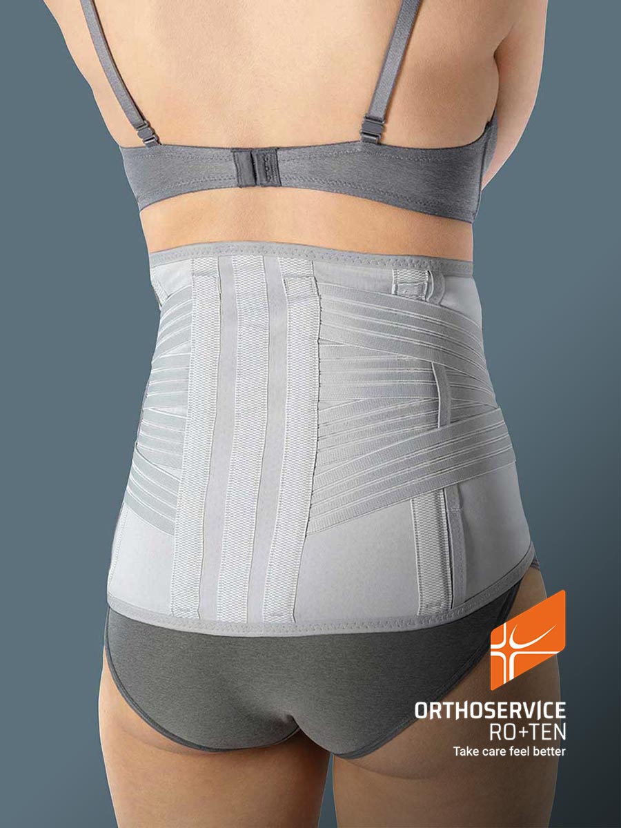 Busto ortopedico elastico basso per la stabilizzazione e lo scarico del rachide lombare, con pelotte rigide termoformabili