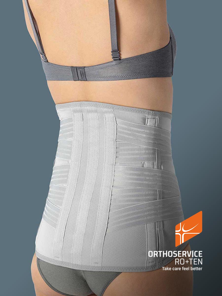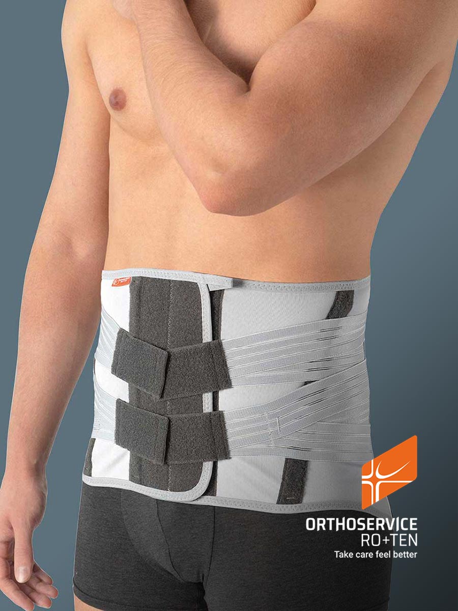 Busto ortopedico elastico alto, per la stabilizzazione e lo scarico del rachide lombare, con pelotte rigide termoformabili