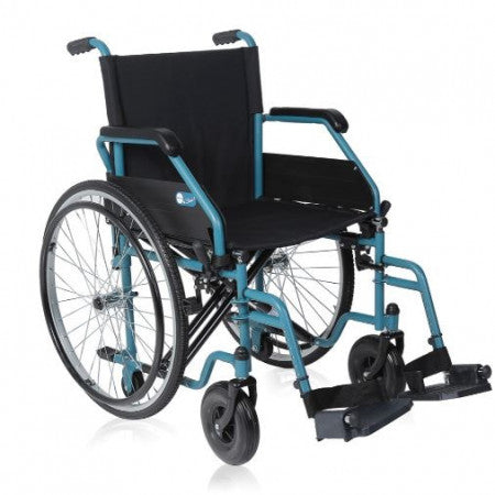 Telaio stabilizzante in acciaio verniciato DOPPIA crociera, seduta e schienale in nylon nero, imbottito e lavabile, tasca porta documenti sul retro. Ruote posteriori (Ø 60 cm) in alluminio a razzi con sgancio rapido, gomme nere in PU senza camera d’aria, ruotine di sicurezza e corrimano in acciaio verniciato nero. Doppio foro sulla struttura per trasformazione in carrozzina da transito (kit optional). Ruote anteriori nere in PU con forcella in acciaio. Braccioli semi-lungo ribaltabile imbottitura in PU. Pedane estraibili regolabili in lunghezza con poggia piedi in polipropilene nero e cinturino ferma-tallone.