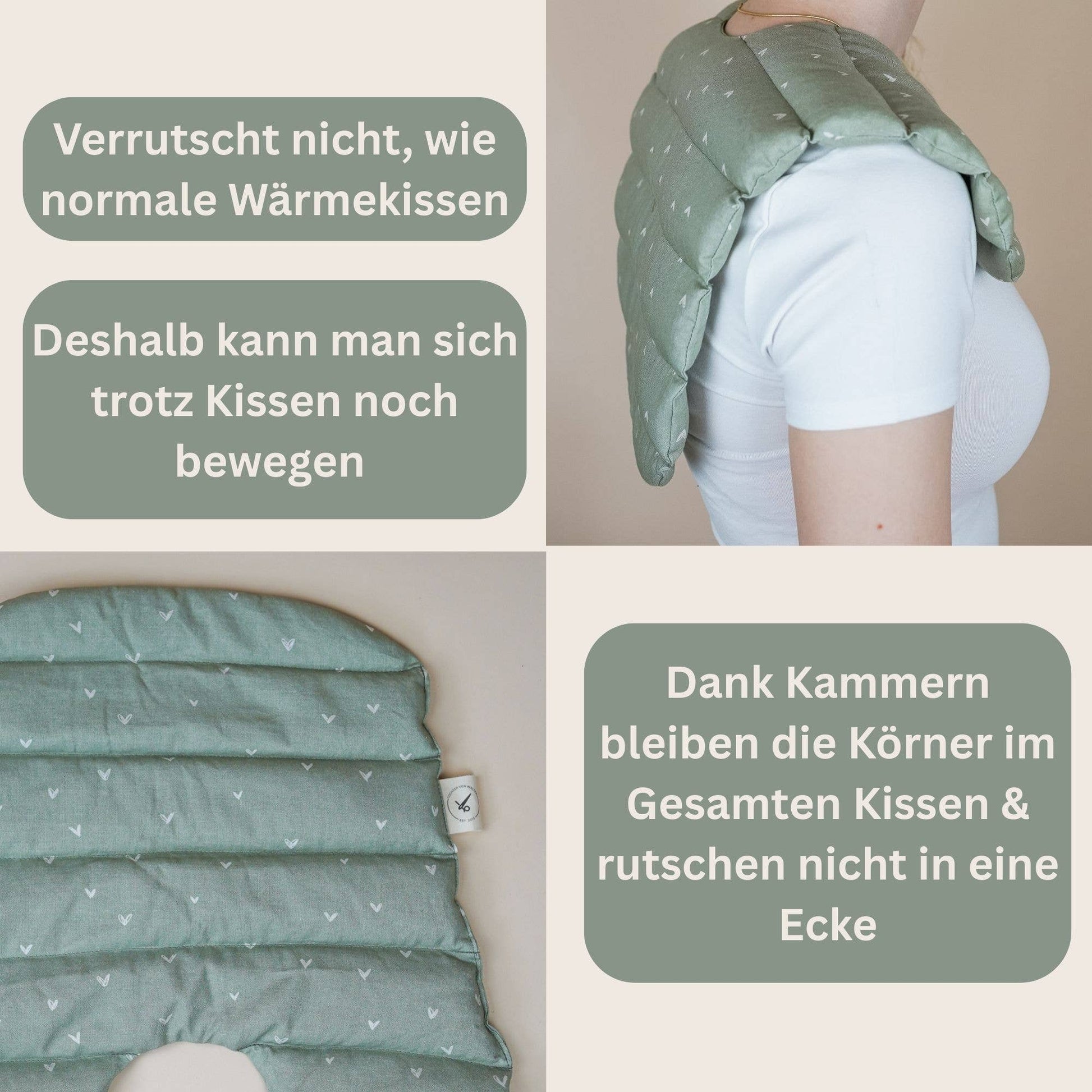 Il cuscino per il collo non solo fornisce un piacevole calore per il collo e le spalle, ma anche per la parte superiore della schiena. Grazie alla pratica suddivisione in camere, il calore rimane distribuito uniformemente - i chicchi non si spostano. La forma tagliata assicura una buona tenuta e il cuscino termico non scivola sulle spalle - nonostante i movimenti in smart working, ecc. Dettagli: - Adatto per microonde, friggitrice ad aria e forno - Include istruzioni - Riempito con 100% farro biologico - Cucito in cotone - con motivi di artiste donne - Prodotto in Europa - Perfetto come regalo ad esempio per Natale, per future mamme, amanti della lettura, ecc.
