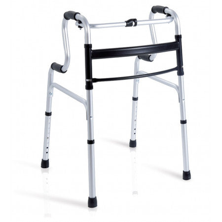 Deambulatore pieghevole con quattro puntali, costruito in alluminio anodizzato colore blu.