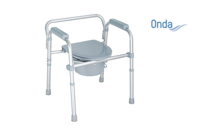 Comprende quattro funzioni in una: rialzo stabilizzante per water, supporto per water, sedia comoda e sedile per doccia. Versione pieghevole.