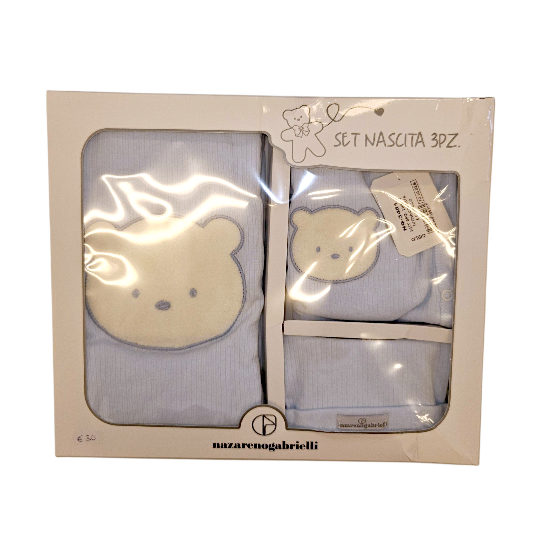 Set nascita 3 pz. completino, cappellino e copertina 100%cotone 1-3 mesi. NAZARENO GABRIELLI