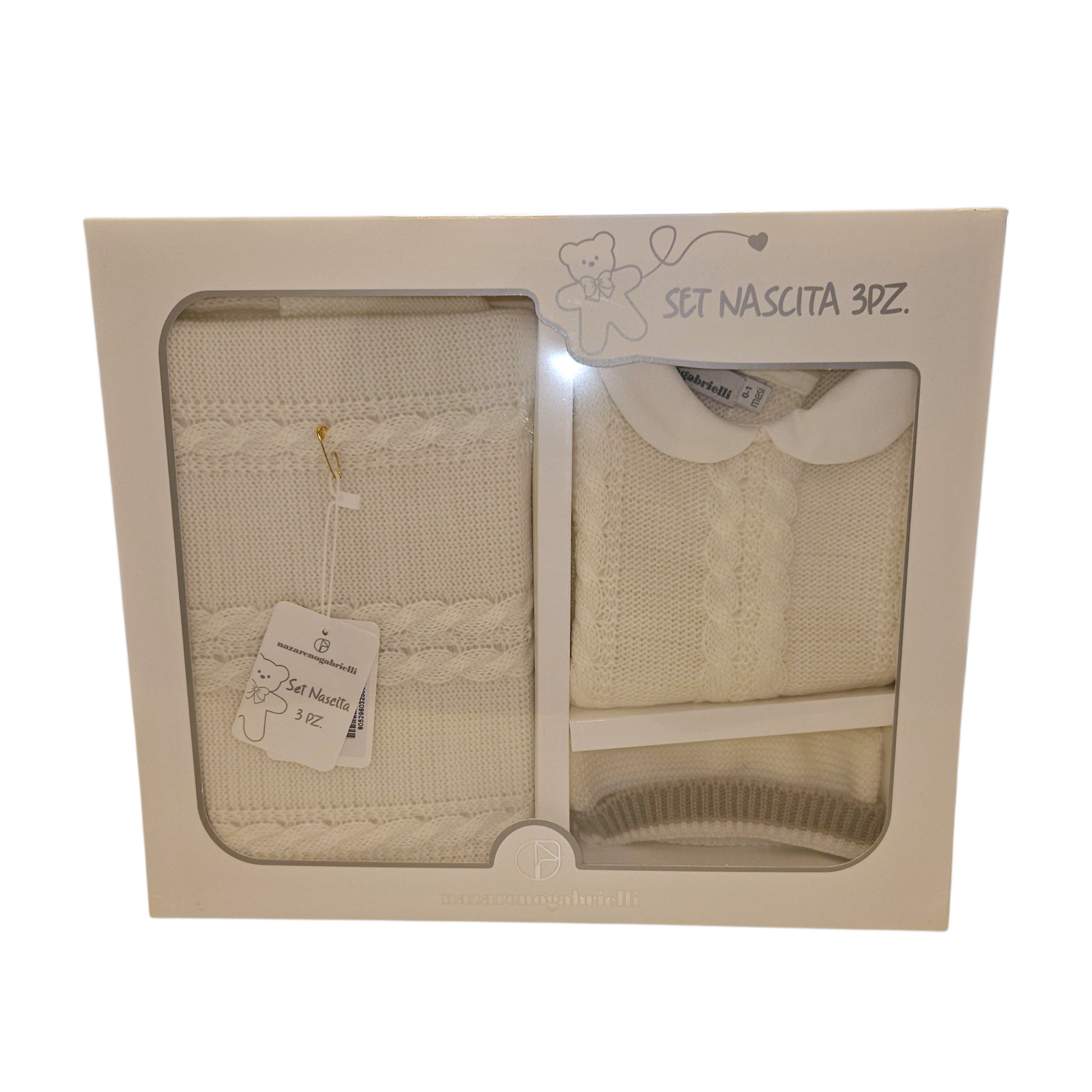 Avvolgi il tuo neonato in un abbraccio di morbidezza con questo set nascita di Nazareno Gabrielli. Comprende tutina, copertina e cappellino realizzati in lana soffice, ideali per i primi mesi di vita (0-1 mese). Perfetto per garantire comfort e calore delicato sulla pelle sensibile del tuo bambino, questo set unisce qualità e cura in ogni dettaglio. Scegli il meglio per il tuo piccolo fin dal primo giorno.